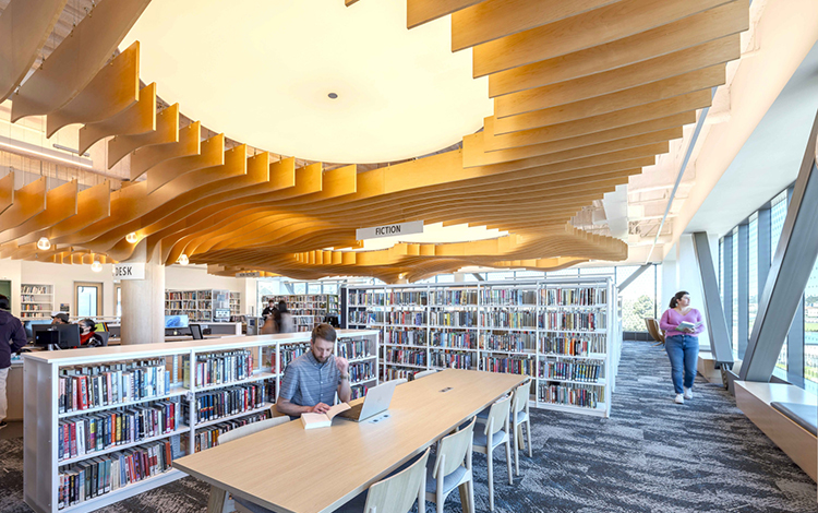 Libraries are famously known as places for quiet, and these large area suspended SkySpan systems make a significant contribution to noise reduction while providing natural feeling light that is comfortable and shadowless, allowing patrons to read even the smallest print from any angle. In addition to circles, the library also features a unique “merged circles” shape (not shown) made possible by taking advantage of SkySpan’s design flexibility.
