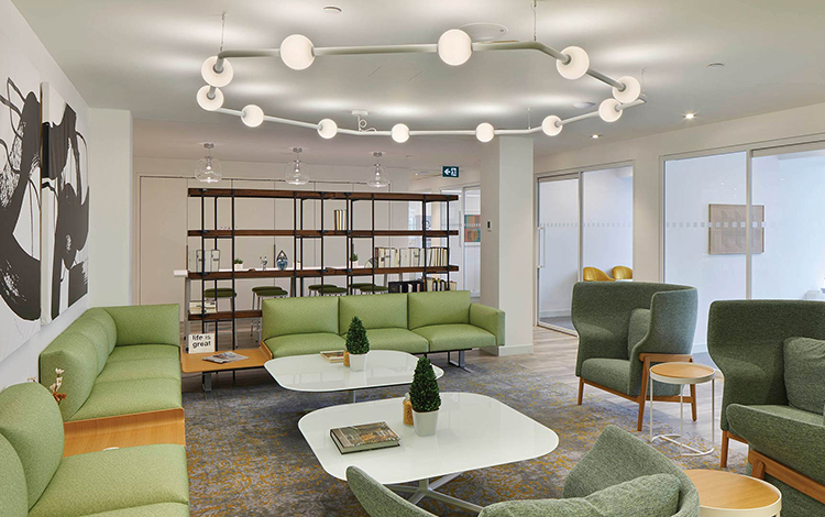 The 25th-floor rooftop deck is a stunning L-shaped space offering a variety of seating options. Cozy chairs and sofas are arranged around fire pits, while café-style seating is positioned near the barbecue areas, creating inviting spots for gathering and dining. Scena SN805 luminaires are mounted along the structural walls of the 25th-floor rooftop deck, promoting a feeling of security as residents exit the building and reach the deck.