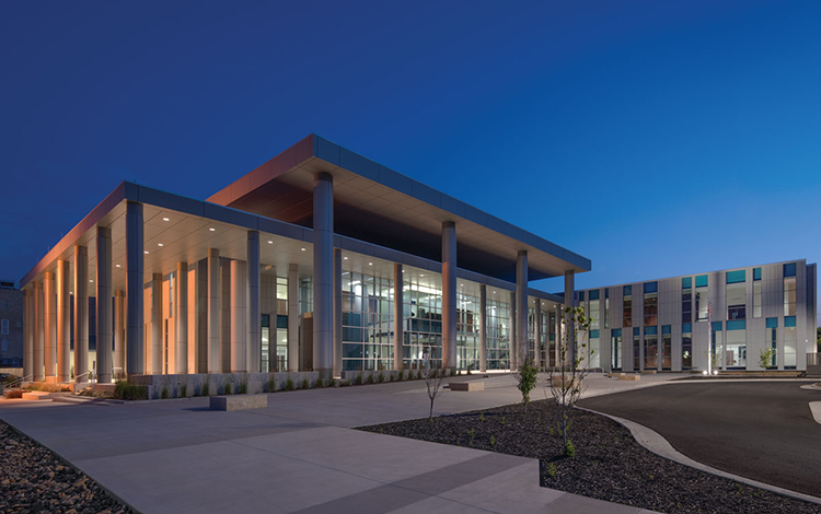 The lighting design accentuates the building's soaring geometry and material contrasts, bringing warmth and depth to the exterior while maintaining a refined collegiate atmosphere. The Lumenbeam Large uplights highlight vertical stone piers with crisp precision, while Lumenfacade Inground fixtures subtly graze glass fins and entrances, guiding students and visitors with soft, even illumination.