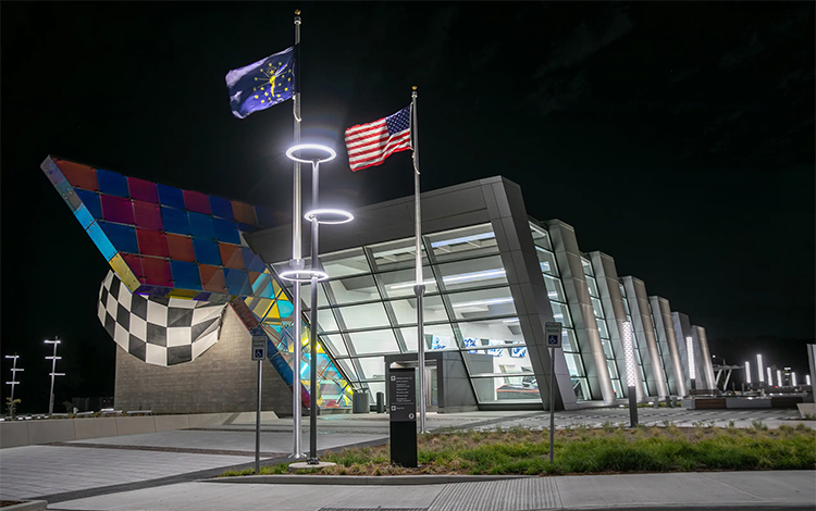 Designed by Indianapolis-based Synthesis Incorporated, the architecture translates speed, motion, and racing heritage into built form. Alternating angled glass planes and exposed metal brackets arranged in decreasing size create a forced perspective that evokes the sensation of an IndyCar racing past at full throttle. Layered materials and graphic cues, including an abstracted checkered-flag motif and color-shifting dichroic glass, extend that narrative, immersing visitors in the sights and emotions of race day.