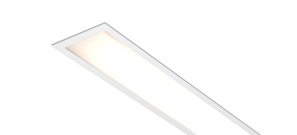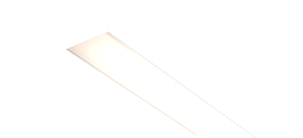 Recessed extruded aluminum linear lighting system that can be specified in a variety of lengths. An extruded impact resistant frosted acrylic lens provides a diffused glow. Trimless installation option, and dimming version available.
