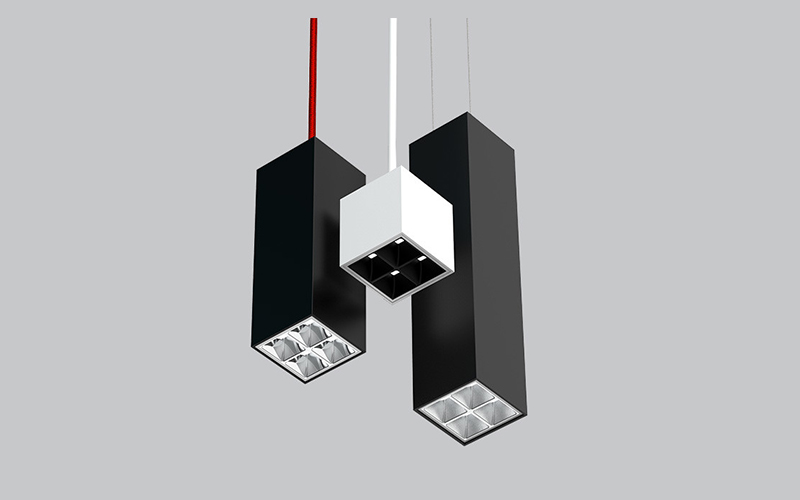 Cluster pendants include linear and planar configurations with downlight, parabolic, and wall wash optics that match recessed types. Linear pendants are available in 1-, 3-, and 5-cell configurations; planar pendants in 2x2 and 3x3 arrays. Pendant Clusters fit a choice of 3", 8" or 12" deep cuboid enclosures. Nominal light output is 200 lumens per cell with efficacy over 80 LPW. Pendant Clusters can be suspended using stems, cord & cable, or power-over-cable. A canopy for conduit connection is available. Driver is either integral or remote, which is capable of powering multiple luminaires.