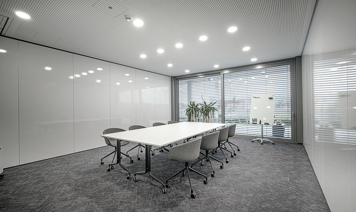 The architect opted for an architecture flooded with daylight and air. The all-glass facades of the administrative floors illustrate this. Floor-to-ceiling glass fronts on three sides of the building allow daylight to stream in. This concept is supported in the office areas by LIGHTPAD. "The aim was to find a luminaire that matches the reduced architecture of the building. LIGHTPAD by Regent Lighting speaks the same design language as the rooms: it is angular and slim and provides beautiful and optimal illumination of the workspaces. The incomparably flat luminaire head was particularly decisive," explains Wäschle. The use of freestanding luminaires also allows for unlimited flexibility in furnishing. Thanks to the hollow space floor in all office areas, workplaces can be arranged randomly, and LIGHTPAD can easily, quickly and flexibly be moved in accordance. In the warehouse and production areas, however, the TRAQ row lighting system is used. Thanks to the latest LED technology, it provides uniform, bright lighting with natural colour rendition. Finally, the MEDRA downlights blend beautifully and unobtrusively into the architecture, creating a calm, flat appearance of the suspended acoustically perforated ceilings.