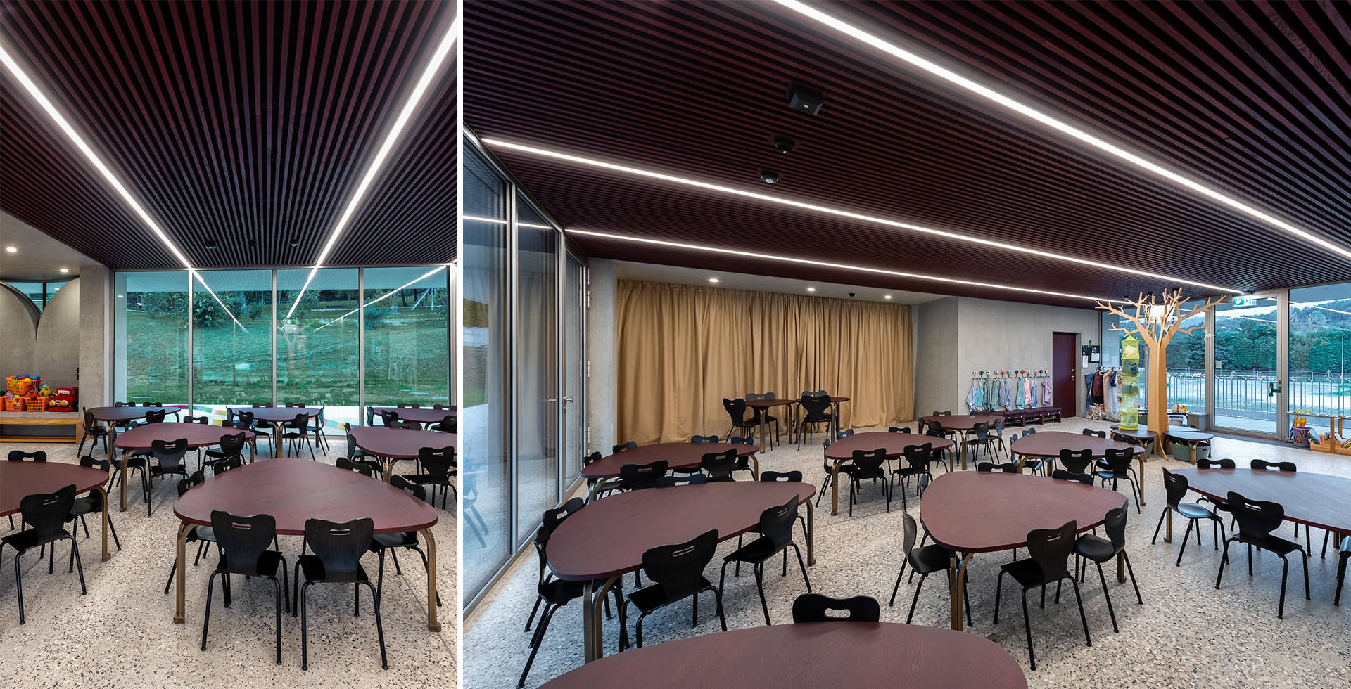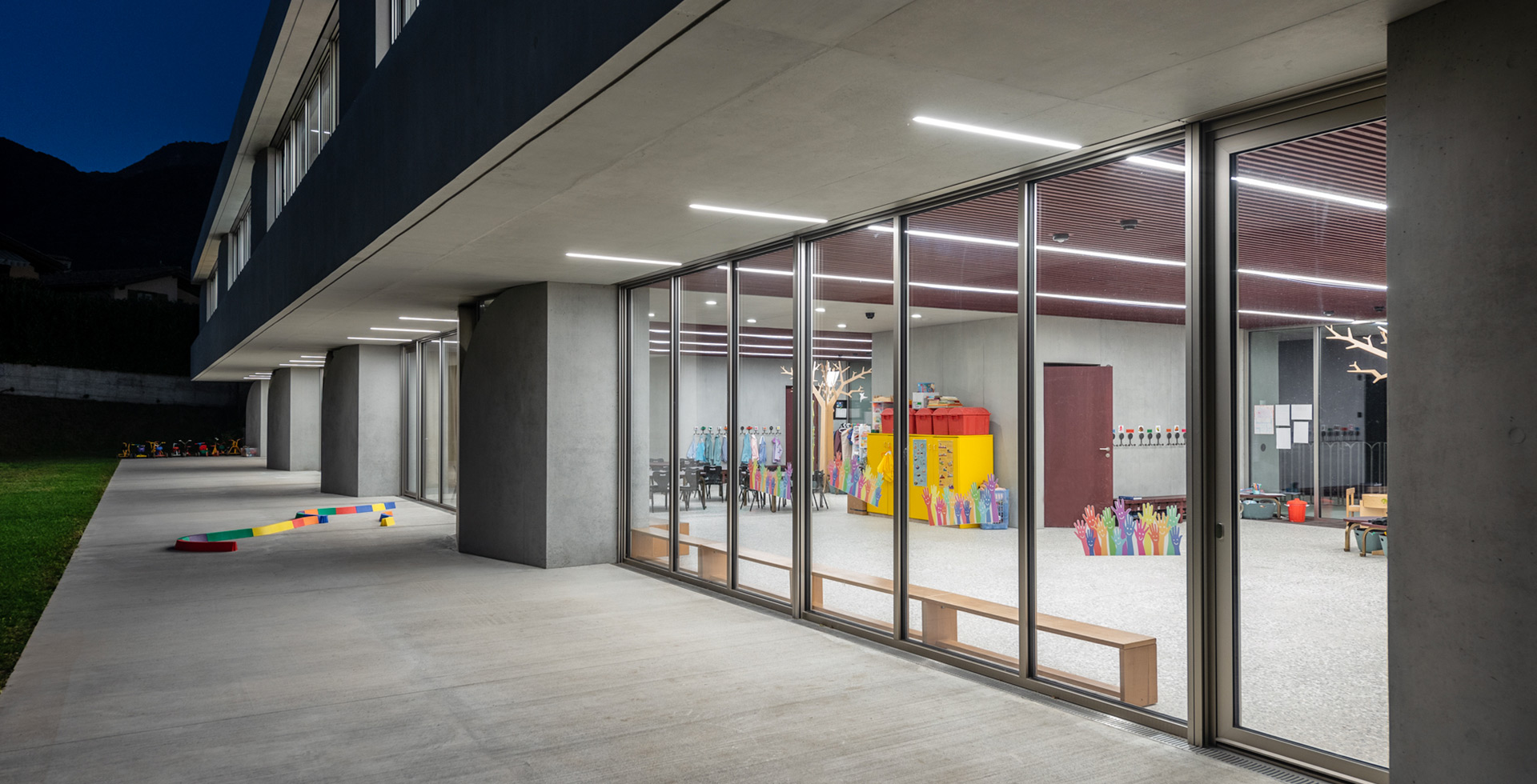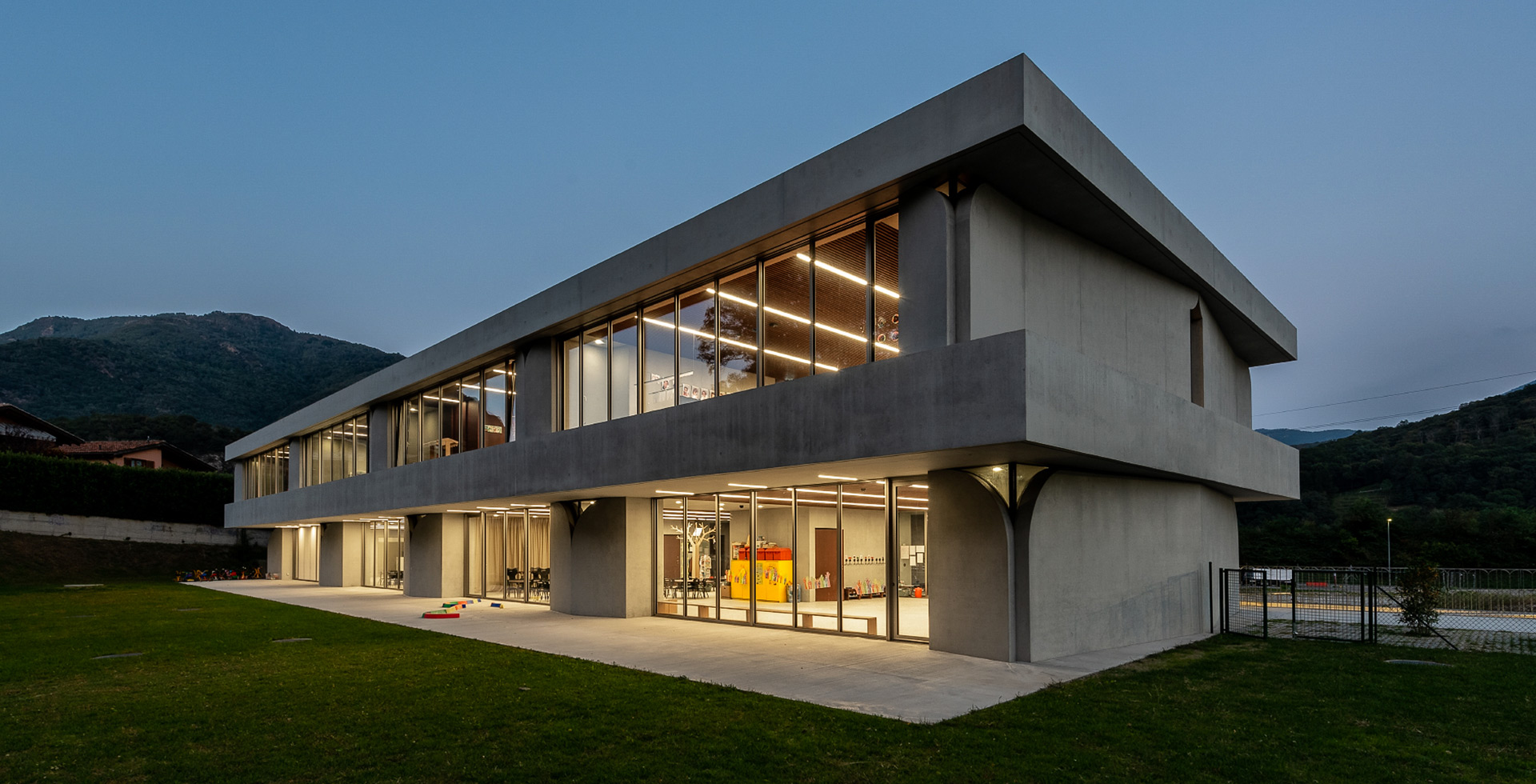 A kindergarten characterised by sophisticated architecture where the architect has taken care of every single detail, enriching it with a distinctive mark that is shown both outside and inside, not only in the structure of the school but also in details of street furniture such as the parapet.