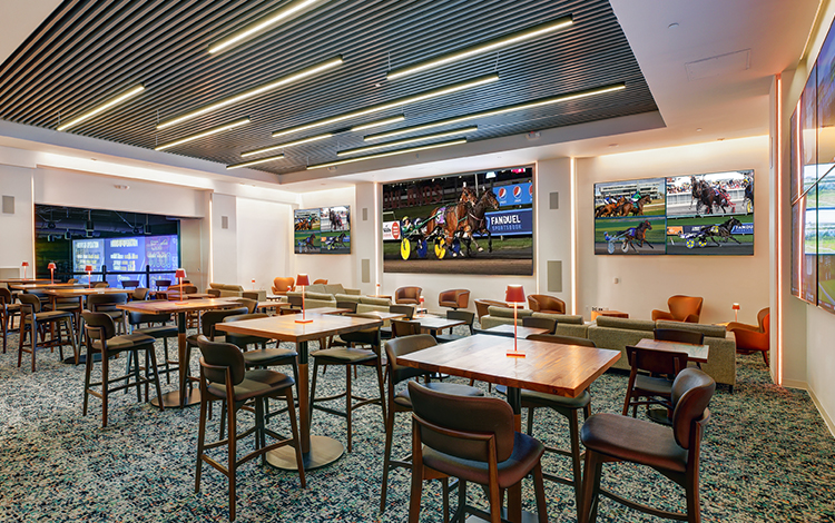 At the Meadowlands Racetrack in New Jersey, not only can you play the ponies, you can also bet on any other sport in the massive FanDuel Sportsbook area of the facility. Overlooking this area is a room known as The Gallery, which can be rented for private events and parties, with a private bar, food buffet station and multiple screens including a 220" behemoth. Lighting was needed that would enhance the immersive experience, and Interior/Lighting Designer Nancy Mah was brought in to make a space worthy of any event.